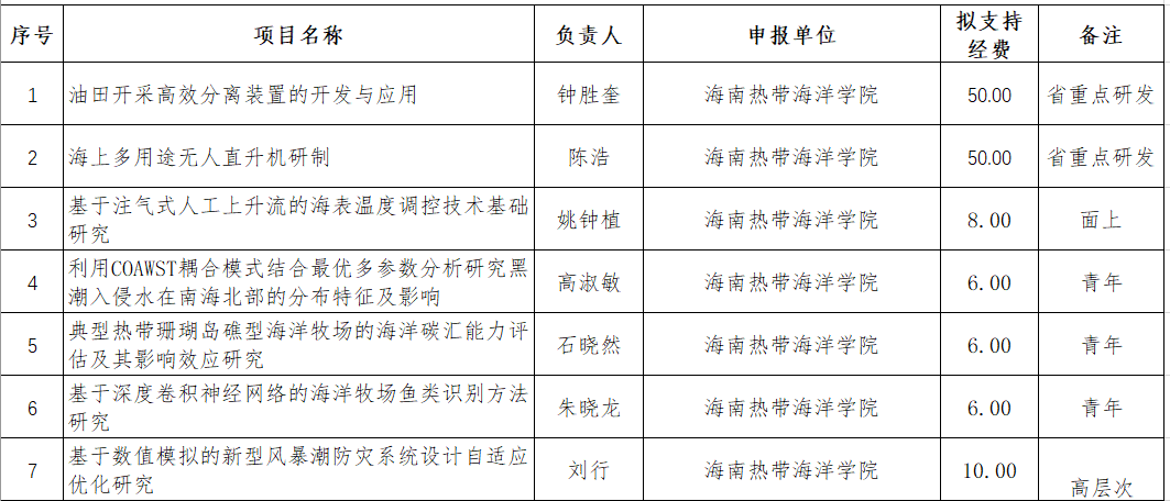 根据海南省科学技术厅发布的《海南省科学技术厅关于2022年省重点研发项目(第一批) 拟立项项目和经费安排的公示》和《海南省科学技术厅关于2022年海南省自然科学基金拟立项项目的公示》,我院获7项拟立项项目,其中2项省重点研发项目,5项省自然科学基金,经费共计136万。